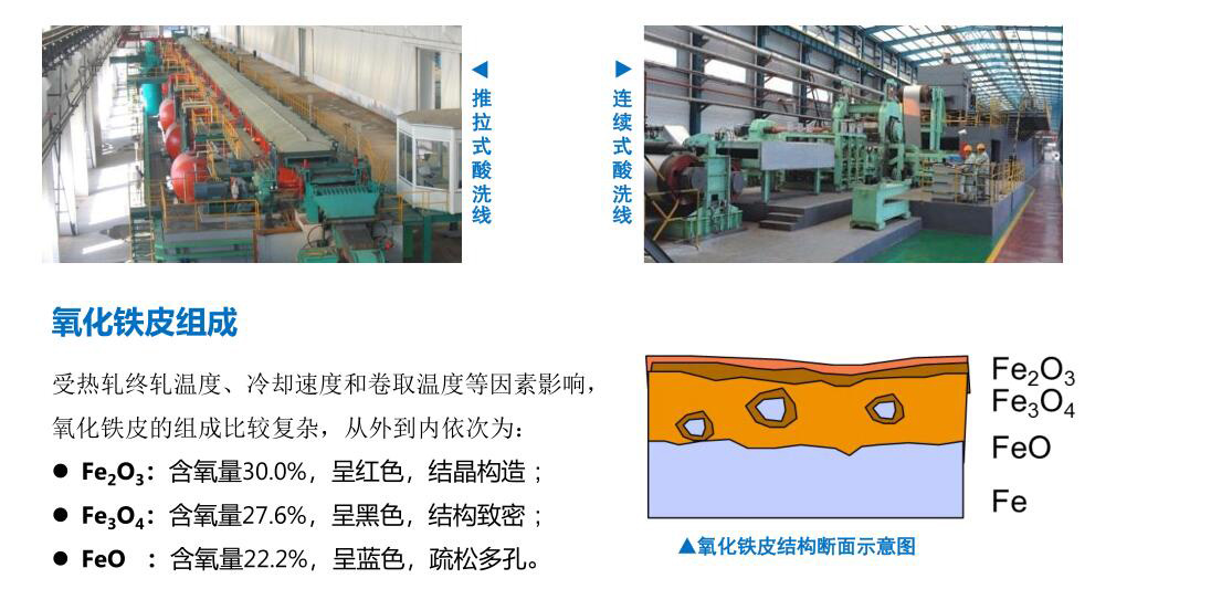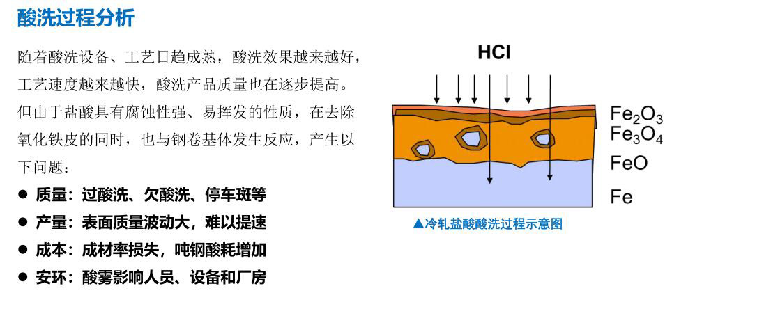 热轧卷在高温卷取和冷却过程中,表面会形成不同程度的氧化铁皮,无法直接轧制。因此需要在冷轧前使用盐酸(或硫酸)将热轧卷表面的氧化铁皮反应去除,此过程称为冷轧酸洗。